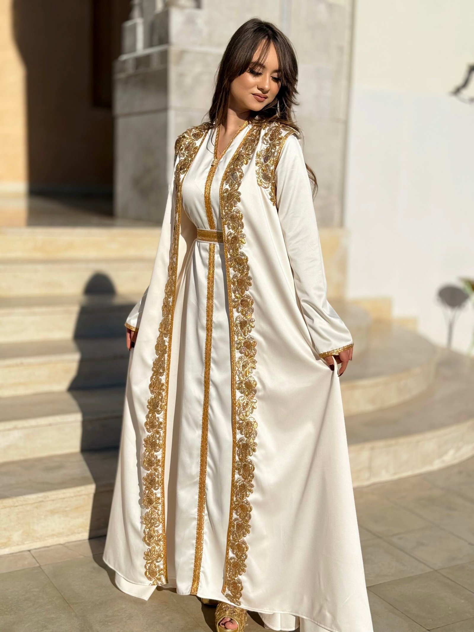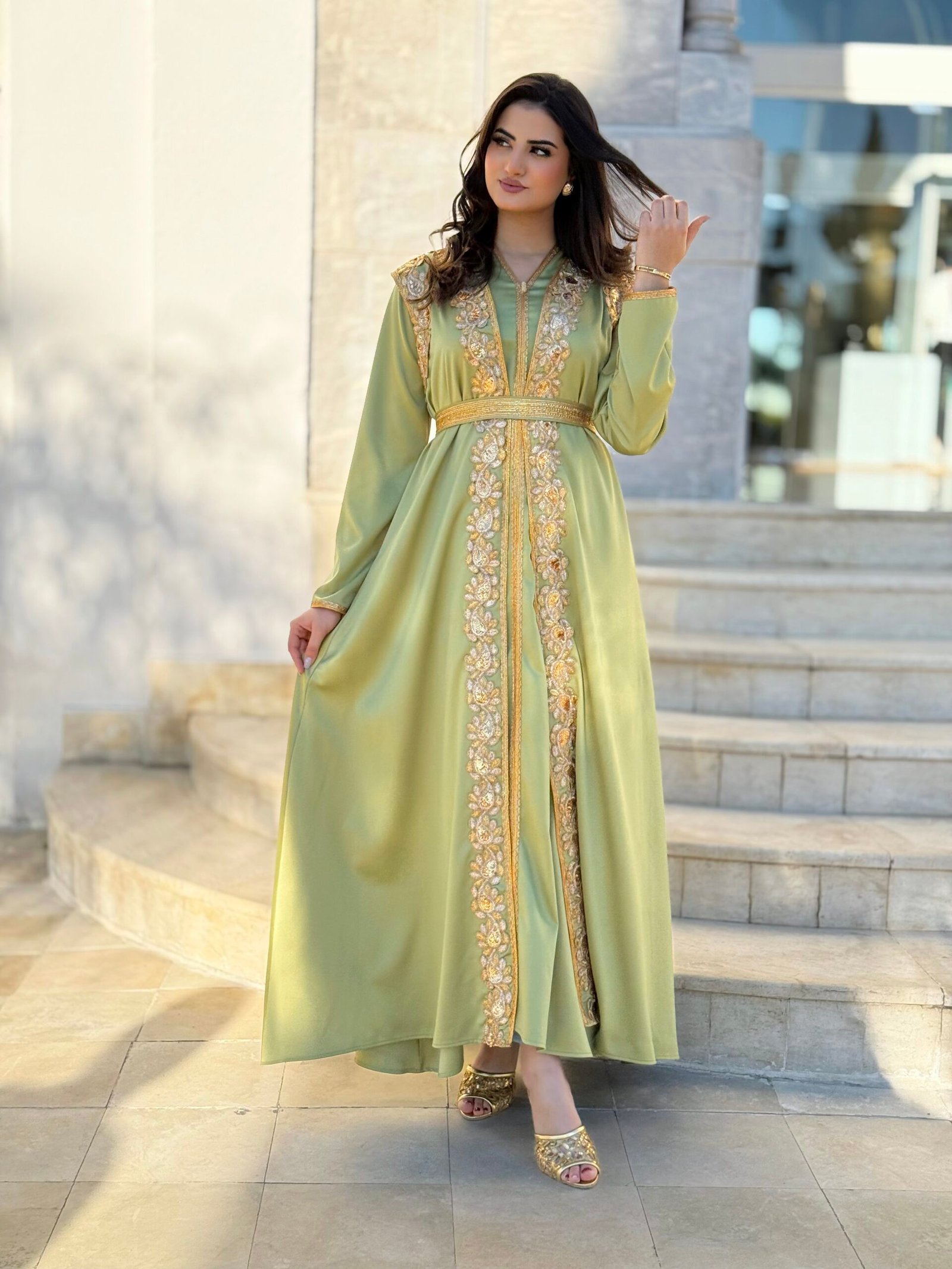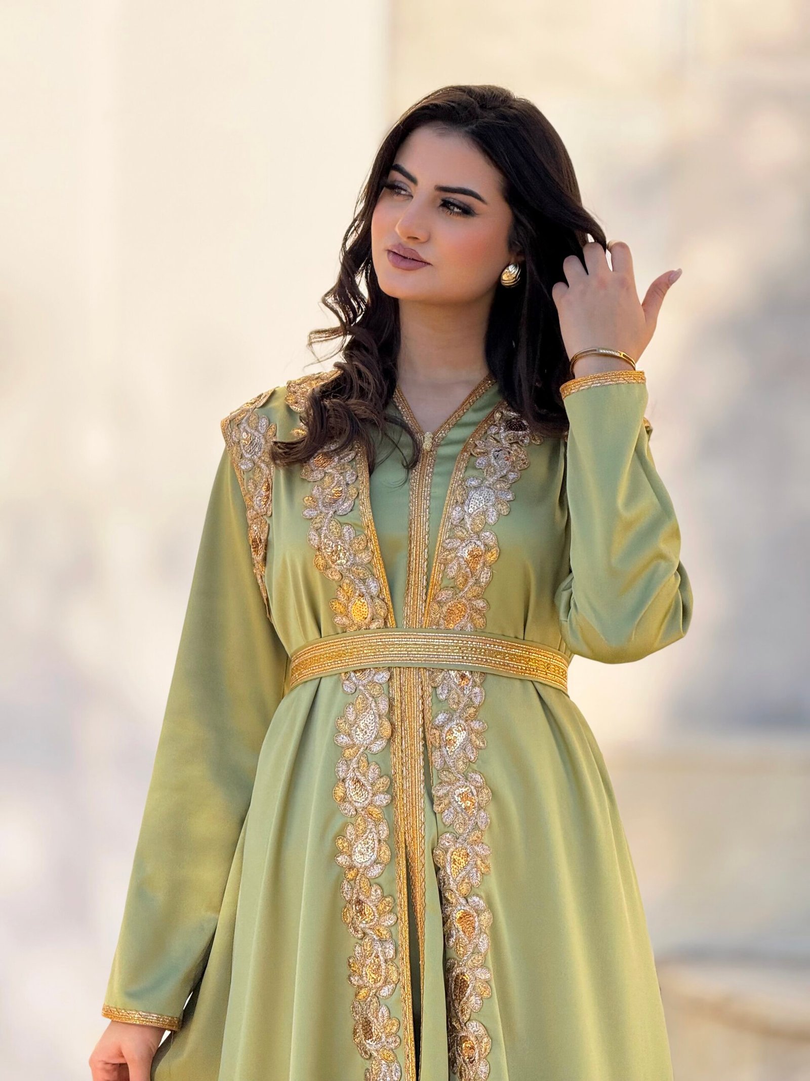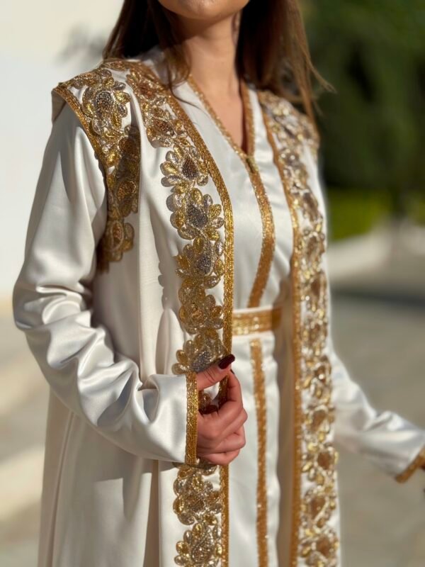 Jouda est un koftan qui allie élégance et modernité. Son tissu léger et ses détails raffinés offrent une silhouette gracieuse et un charme discret.