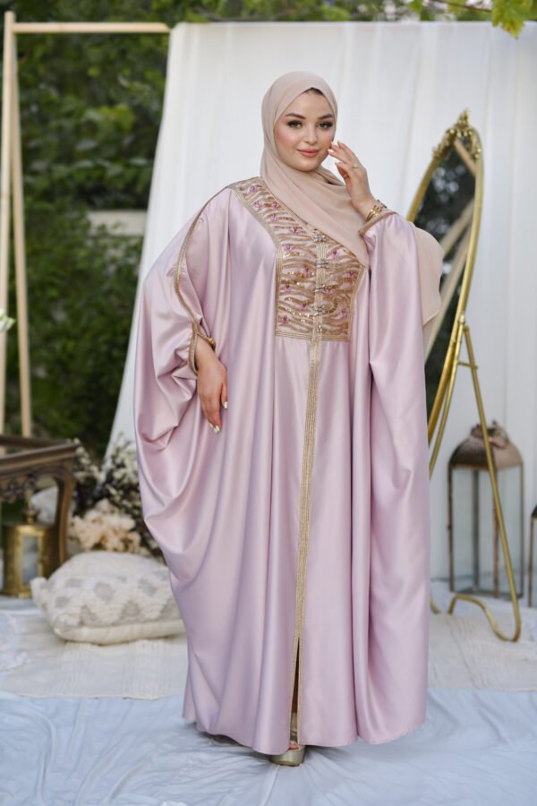 Layan est un koftan qui reflète la splendeur authentique tunisienne. Son tissu léger et fluide, associé à ses broderies traditionnelles, lui confère un éclat particulier, révélant l’élégance et la dignité de celle qui le porte.