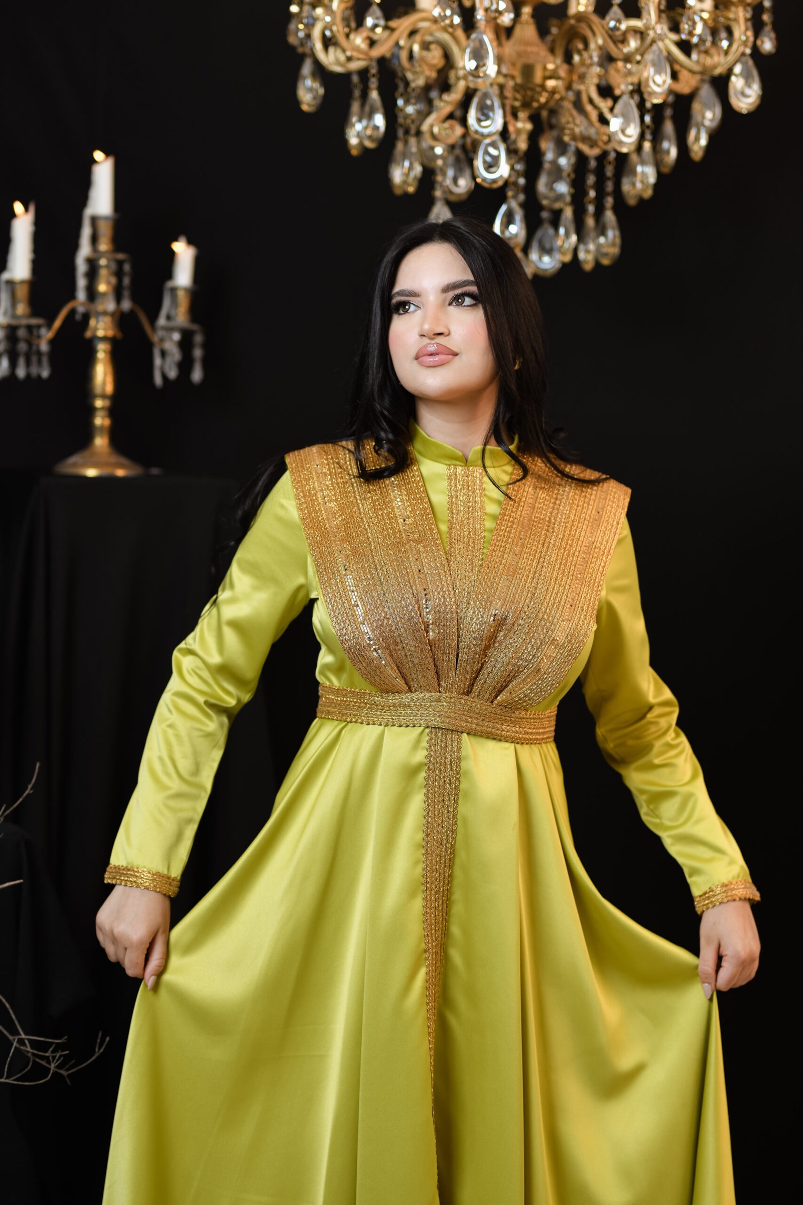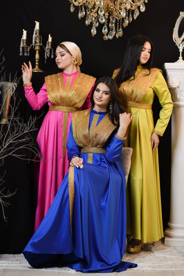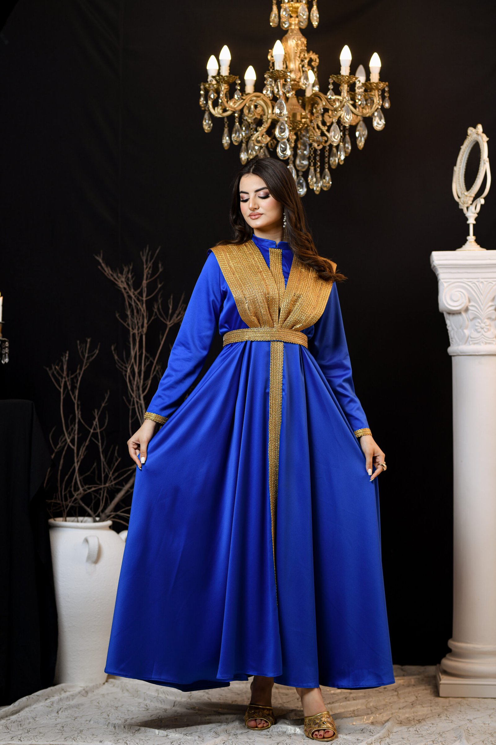 Mesk est un kaftan qui reflète le raffinement et le goût délicat. Son tissu doux et léger, associé à une broderie fine, lui apporte une touche de luxe et d’élégance, révélant la beauté et la grâce de celle qui le porte avec discrétion et noblesse.