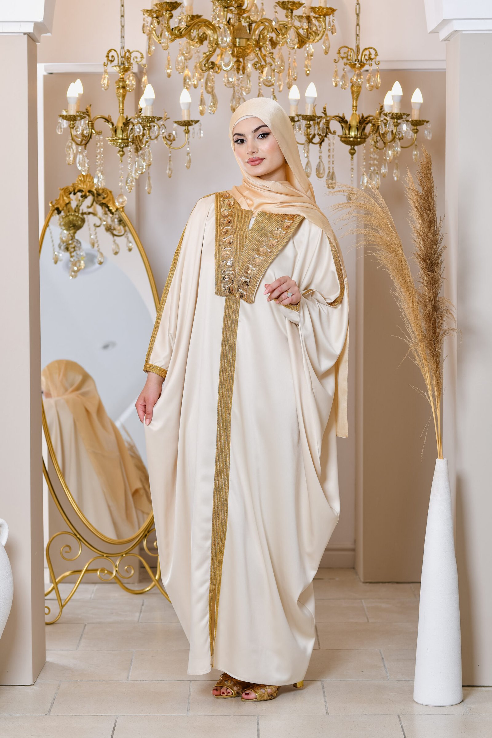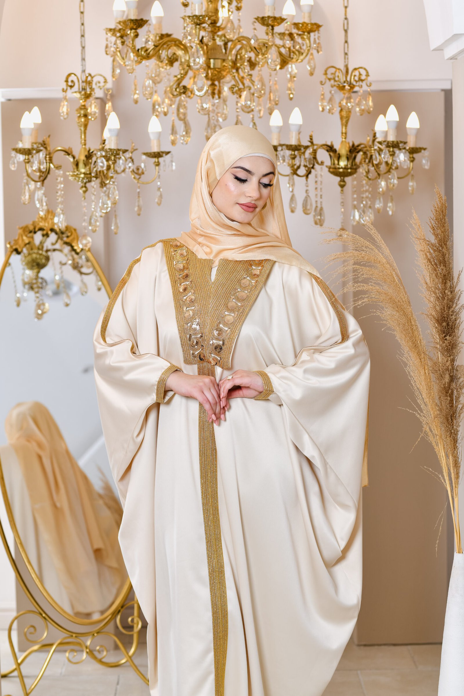 Safia est un kaftan inspiré du patrimoine tunisien, qui brille par sa simplicité et son élégance. Il reflète la pureté et le raffinement, avec un tissu léger et fluide. Ses broderies et ses finitions classiques lui apportent une touche d’authenticité et de noblesse.