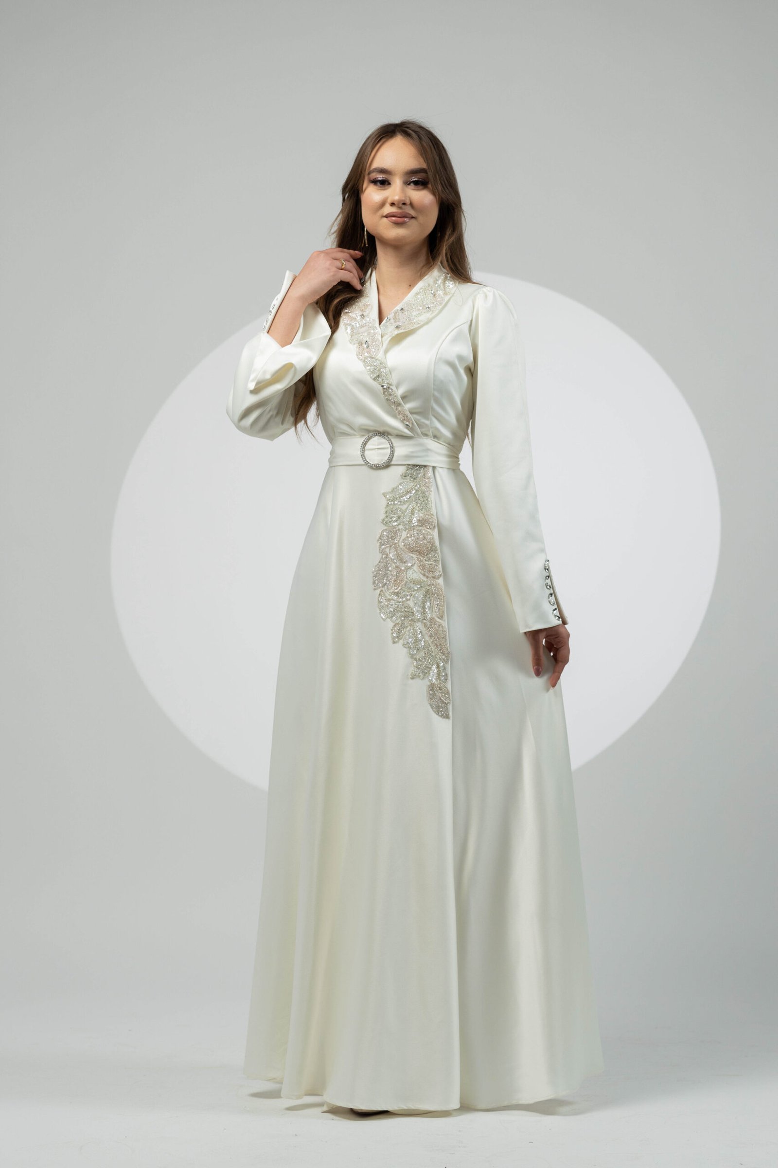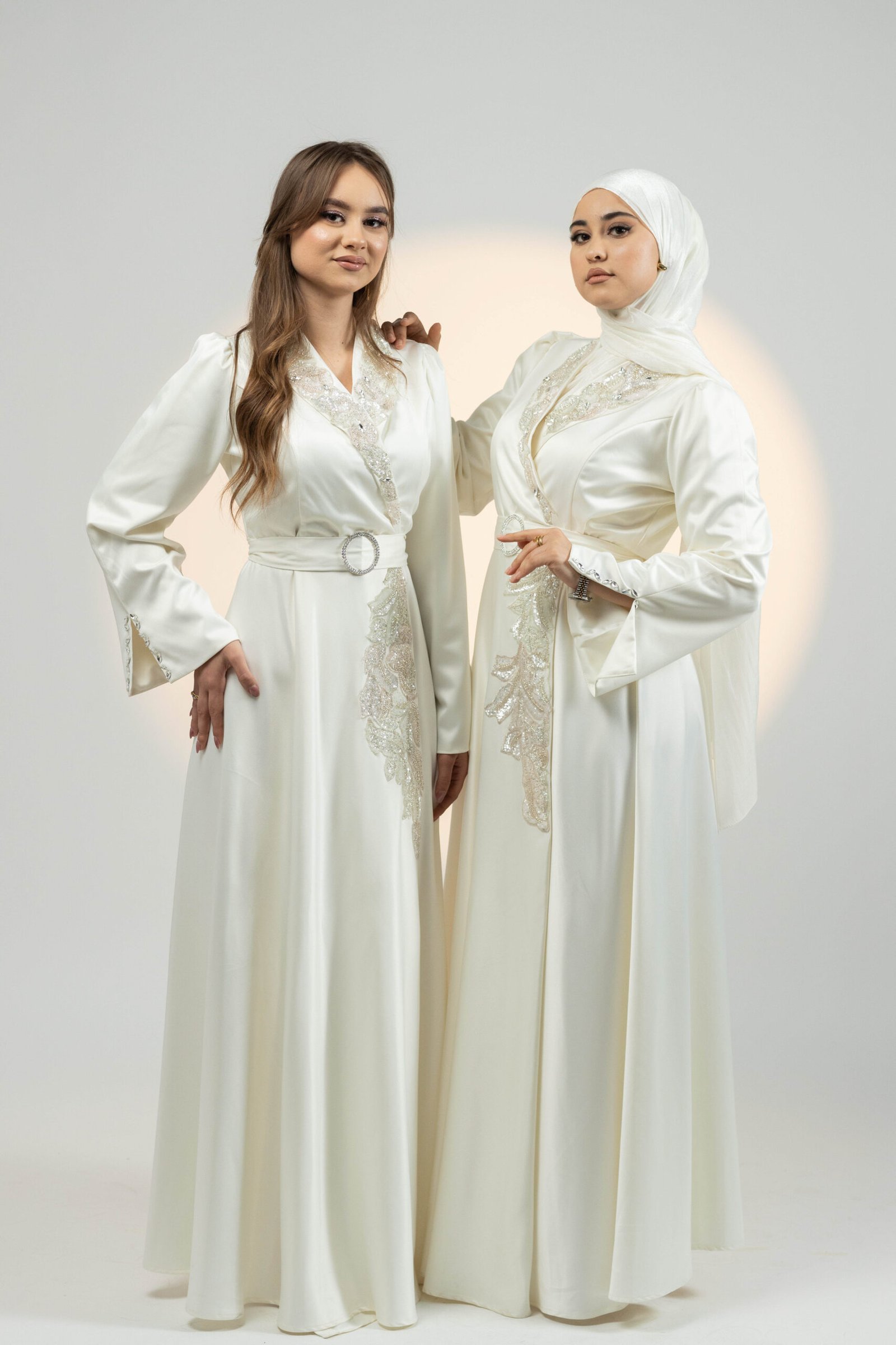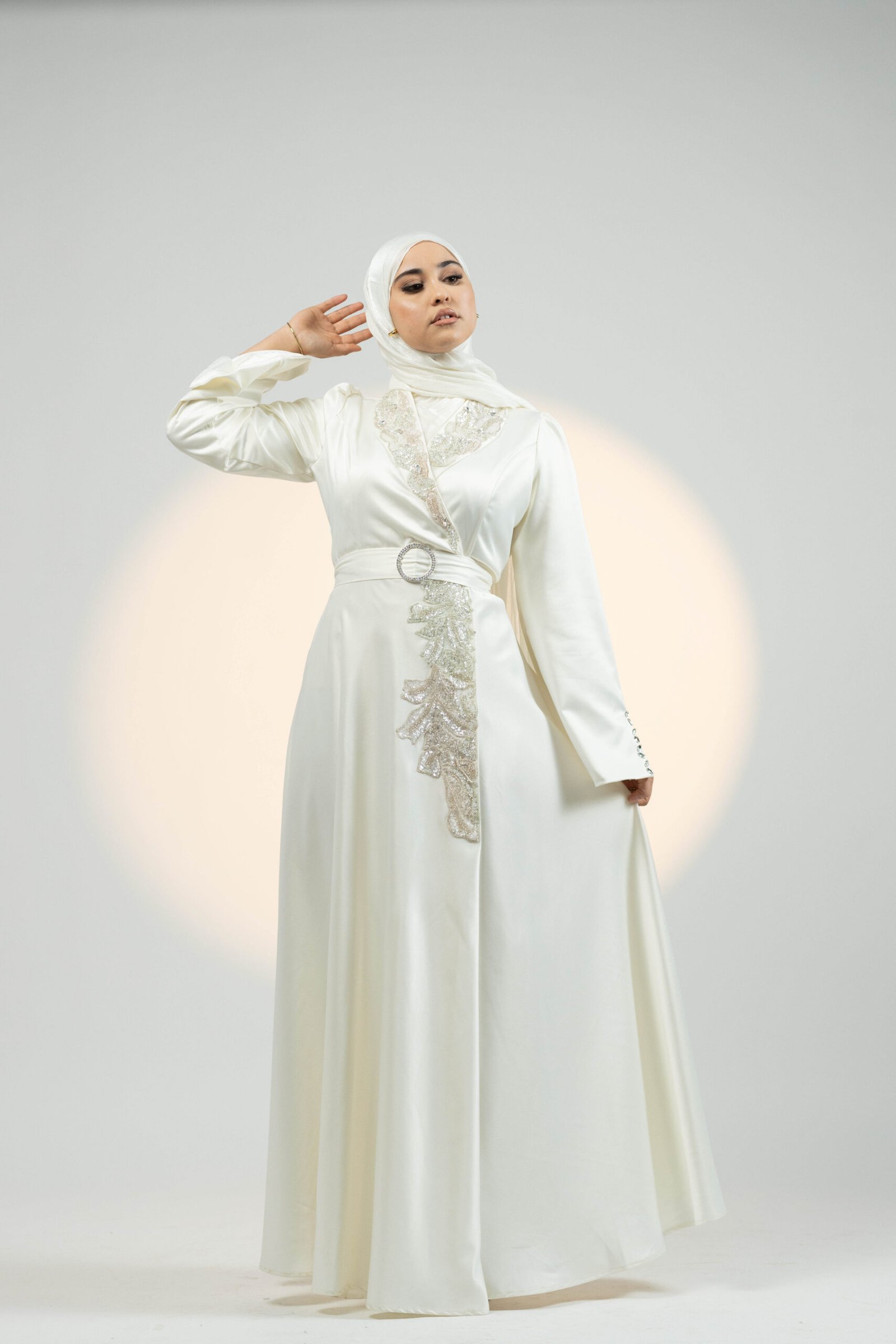 Waaed est une robe de soirée élégante et raffinée. Son tissu léger et sa coupe fluide mettent en valeur une silhouette gracieuse, parfaite pour briller lors des événements spéciaux.